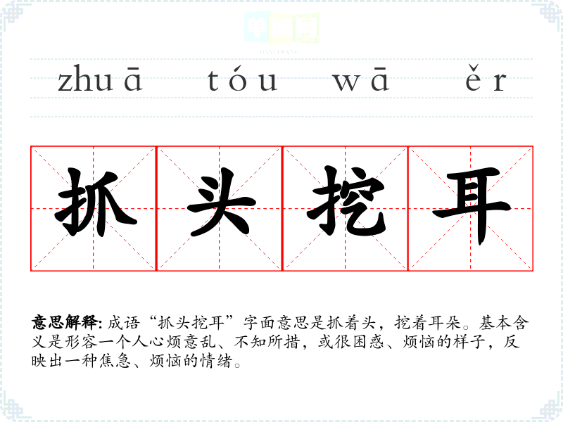 成语“抓头挖耳”字面意思是抓着头,挖着耳朵。基本含义是形容一个人心烦意乱、不知所措,或很困惑、烦恼的样子,反映出一种焦急、烦恼的情绪。