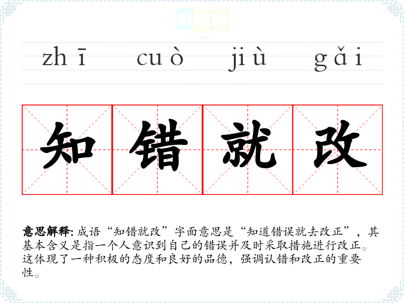 成语“知错就改”字面意思是“知道错误就去改正”,其基本含义是指一个人意识到自己的错误并及时采取措施进行改正。这体现了一种积极的态度和良好的品德,强调认错和改正的重要性。