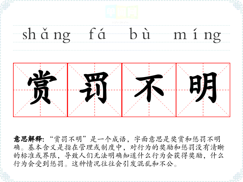 - “模糊不清”:指事物的界限不明确,类似于“赏罚不明”。