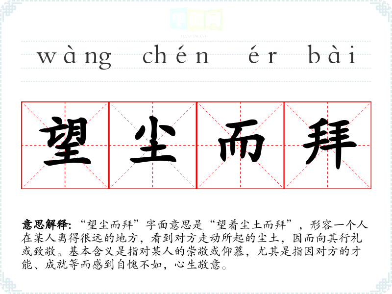 “望尘而拜”字面意思是“望着尘土而拜”,形容一个人在某人离得很远的地方,看到对方走动所起的尘土,因而向其行礼或致敬。基本含义是指对某人的崇敬或仰慕,尤其是指因对方的才能、成就等而感到自愧不如,心生敬意。