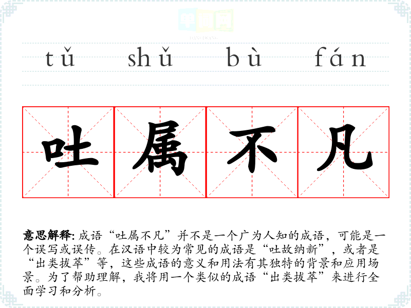 成语“吐属不凡”并不是一个广为人知的成语,可能是一个误写或误传。在汉语中较为常见的成语是“吐故纳新”,或者是“出类拔萃”等,这些成语的意义和用法有其独特的背景和应用场景。为了帮助理解,我将用一个类似的成语“出类拔萃”来进行全面学*和分析。