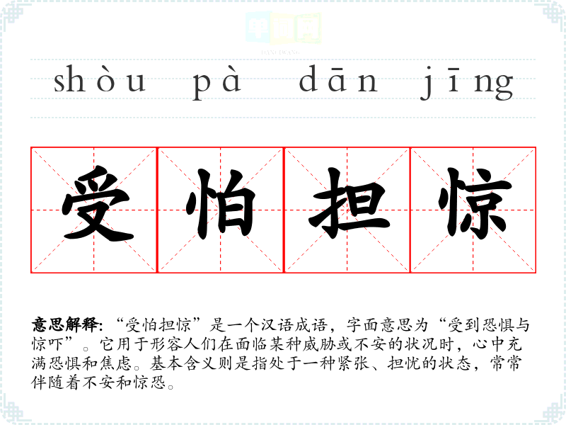 | 受怕担惊 | 形容十分担心或害怕。 |