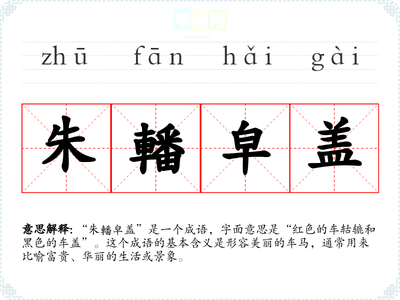 “朱轓皁盖”是一个成语,字面意思是“红色的车轱辘和黑色的车盖”。这个成语的基本含义是形容美丽的车马,通常用来比喻富贵、华丽的生活或景象。