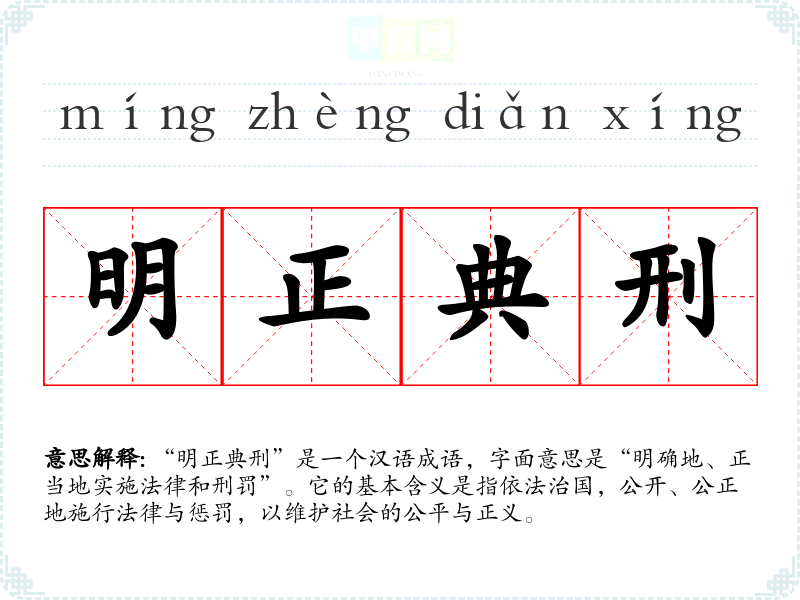 “明正典刑”是一个汉语成语,字面意思是“明确地、正当地实施法律和刑罚”。它的基本含义是指依法治国,公开、公正地施行法律与惩罚,以维护社会的公平与正义。