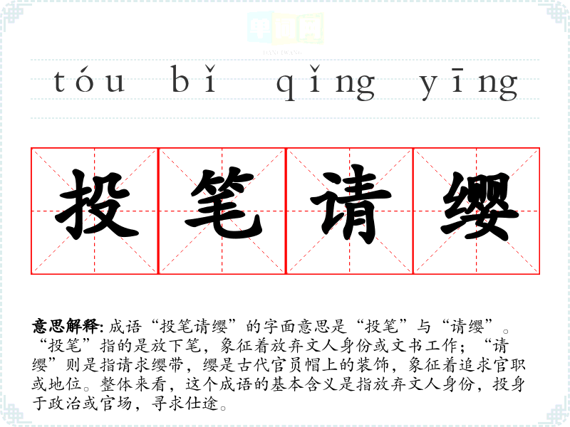 成语“投笔请缨”的字面意思是“投笔”与“请缨”。“投笔”指的是放下笔,象征着放弃文人身份或文书工作;“请缨”则是指请求缨带,缨是古代官员帽上的装饰,象征着追求官职或地位。整体来看,这个成语的基本含义是指放弃文人身份,投身于政治或官场,寻求仕途。