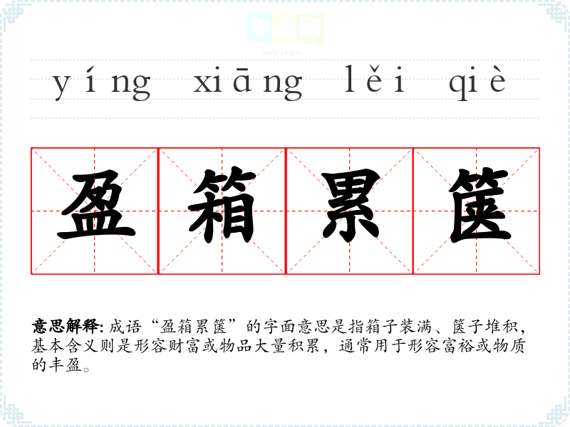成语“盈箱累箧”的字面意思是指箱子装满、箧子堆积,基本含义则是形容财富或物品大量积累,通常用于形容富裕或物质的丰盈。
