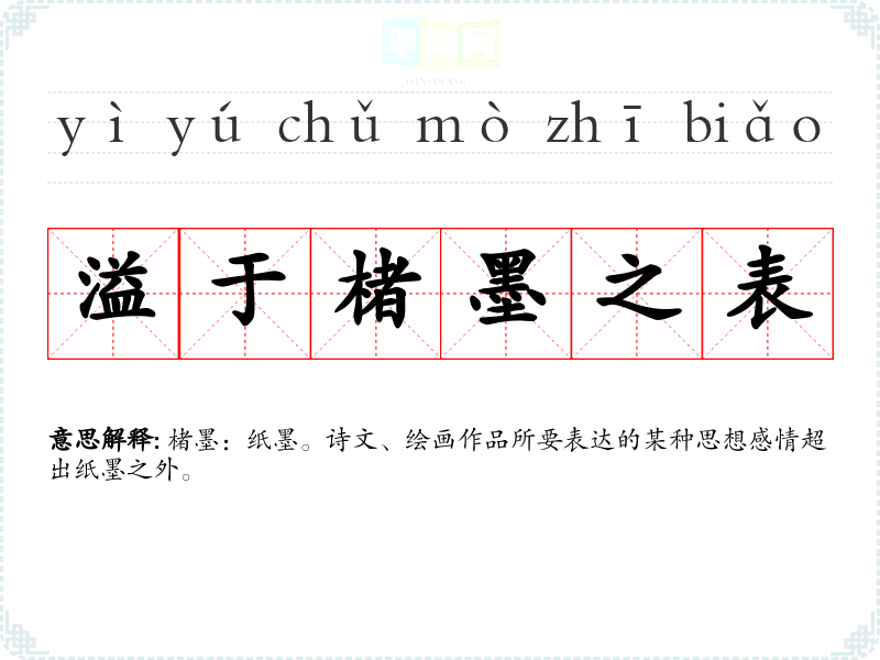 | 溢于楮墨之表 | 楮墨:纸墨。诗文、绘画作品所要表达的某种思想感情超出纸墨之外。 |