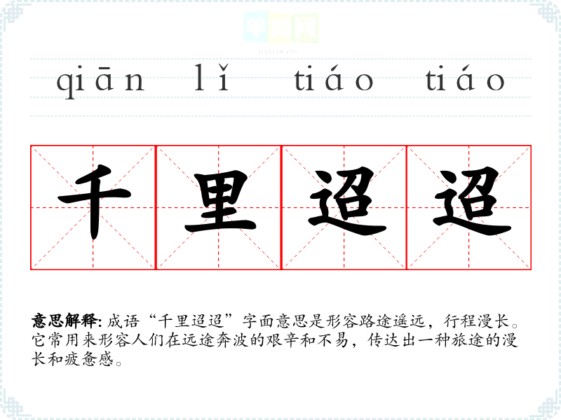 成语“千里迢迢”字面意思是形容路途遥远,行程漫长。它常用来形容人们在远途奔波的艰辛和不易,传达出一种旅途的漫长和疲惫感。