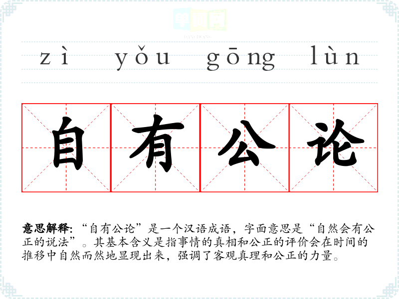 “自有公论”是一个汉语成语,字面意思是“自然会有公正的说法”。其基本含义是指事情的真相和公正的评价会在时间的推移中自然而然地显现出来,强调了客观真理和公正的力量。