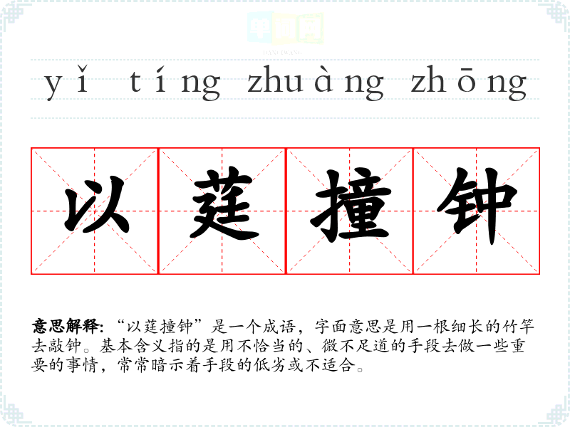 “以莛撞钟”是一个成语,字面意思是用一根细长的竹竿去敲钟。基本含义指的是用不恰当的、微不足道的手段去做一些重要的事情,常常暗示着手段的低劣或不适合。