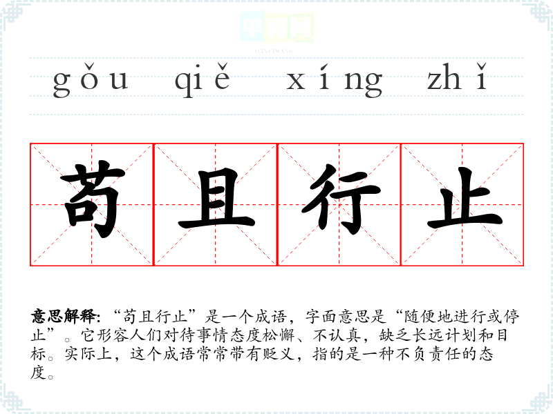 “苟且行止”是一个成语,字面意思是“随便地进行或停止”。它形容人们对待事情态度松懈、不认真,缺乏长远计划和目标。实际上,这个成语常常带有贬义,指的是一种不负责任的态度。