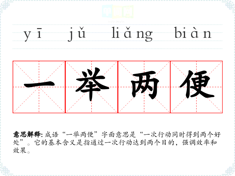成语“一举两便”字面意思是“一次行动同时得到两个好处”。它的基本含义是指通过一次行动达到两个目的,强调效率和效果。