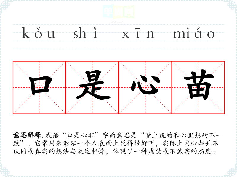 成语“口是心非”字面意思是“嘴上说的和心里想的不一致”。它常用来形容一个人表面上说得很好听,实际上内心却并不认同或真实的想法与表述相悖,体现了一种虚伪或不诚实的态度。