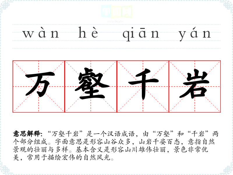 “万壑千岩”是一个汉语成语,由“万壑”和“千岩”两个部分组成。字面意思是形容山谷众多,山岩千姿百态,意指自然景观的壮丽与多样。基本含义是形容山川雄伟壮丽,景色非常优美,常用于描绘宏伟的自然风光。