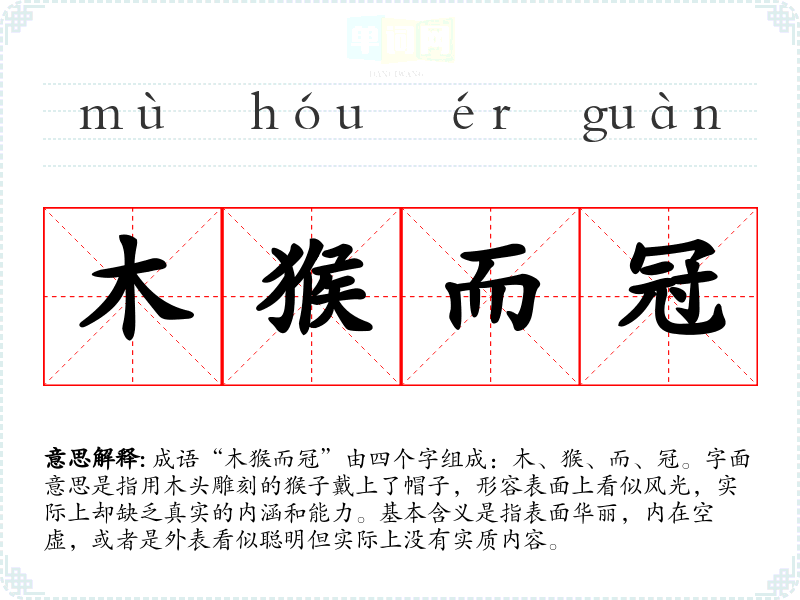 成语“木猴而冠”由四个字组成:木、猴、而、冠。字面意思是指用木头雕刻的猴子戴上了帽子,形容表面上看似风光,实际上却缺乏真实的内涵和能力。基本含义是指表面华丽,内在空虚,或者是外表看似聪明但实际上没有实质内容。