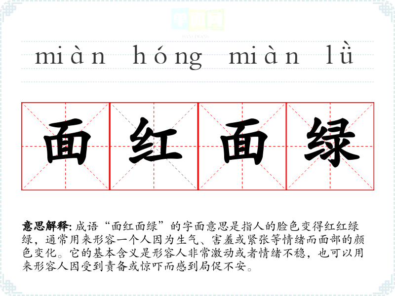 成语“面红面绿”的字面意思是指人的脸色变得红红绿绿,通常用来形容一个人因为生气、害羞或紧张等情绪而面部的颜色变化。它的基本含义是形容人非常激动或者情绪不稳,也可以用来形容人因受到责备或惊吓而感到局促不安。