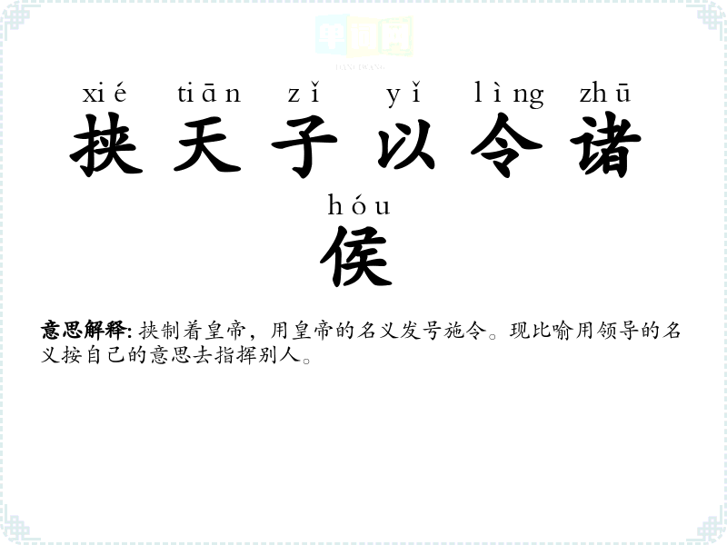 | 挟天子而令诸侯 | 挟:挟制;诸侯:帝王分封的列国统治者。挟制着皇帝,用其名义号令诸侯。比喻借用名义按自己的意思去指挥别人。 |