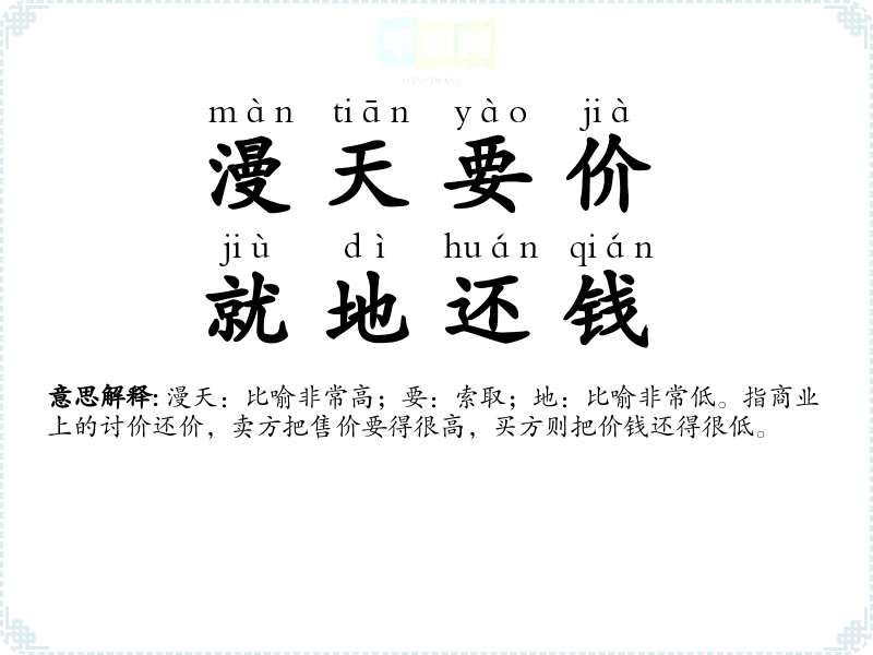 | 上天要价,落地还钱 | 指商业上的讨价还价,卖方把售价要得很高,买方则把价钱还得很低。 |