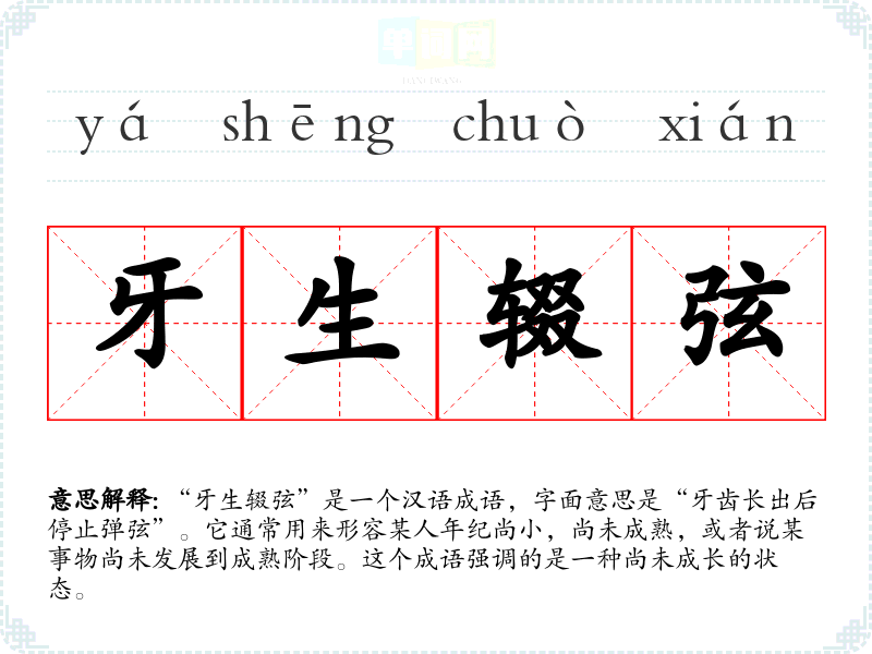 “牙生辍弦”是一个汉语成语,字面意思是“牙齿长出后停止弹弦”。它通常用来形容某人年纪尚小,尚未成熟,或者说某事物尚未发展到成熟阶段。这个成语强调的是一种尚未成长的状态。