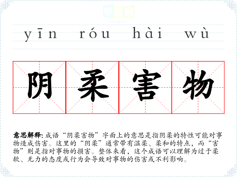 成语“阴柔害物”字面上的意思是指阴柔的特性可能对事物造成伤害。这里的“阴柔”通常带有温柔、柔和的特点,而“害物”则是指对事物的损害。整体来看,这个成语可以理解为过于柔软、无力的态度或行为会导致对事物的伤害或不利影响。