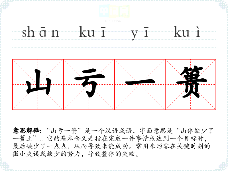 “山亏一篑”是一个汉语成语,字面意思是“山体缺少了一篑土”。它的基本含义是指在完成一件事情或达到一个目标时,最后缺少了一点点,从而导致未能成功。常用来形容在关键时刻的微小失误或缺少的努力,导致整体的失败。