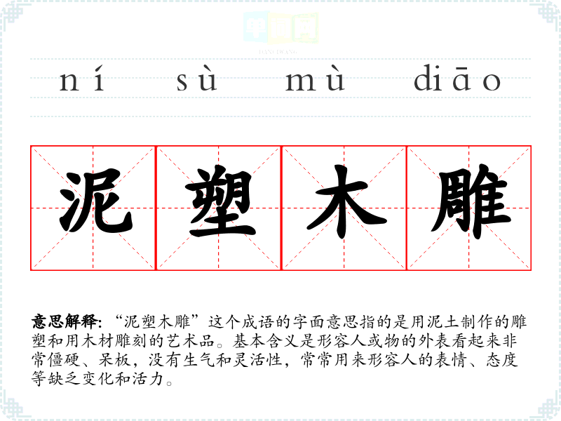 “泥塑木雕”这一成语来源于传统的艺术形式,泥塑和木雕都是古老的工艺,通常被用来制作、民俗等题材的艺术品。它反映了古代工艺美术的特点,强调了形态的固定和不变,因而引申出对人的性格或表现的评价。