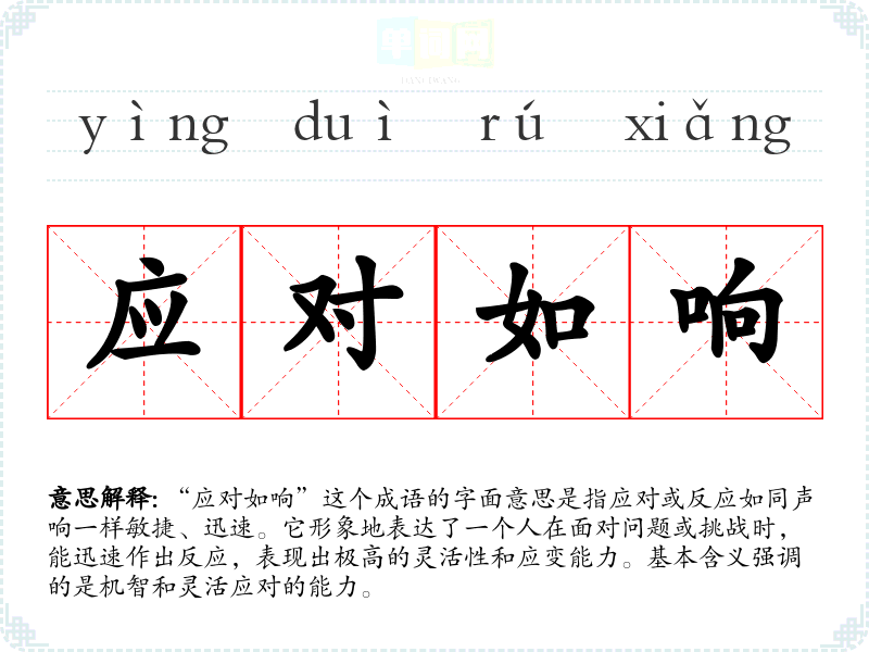“应对如响”这个成语的字面意思是指应对或反应如同声响一样敏捷、迅速。它形象地表达了一个人在面对问题或挑战时,能迅速作出反应,表现出极高的灵活性和应变能力。基本含义强调的是机智和灵活应对的能力。