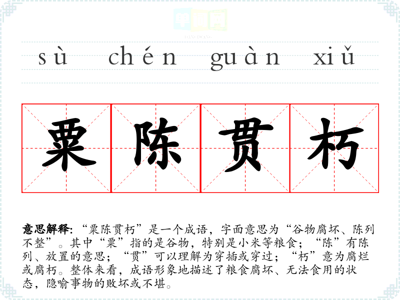 “粟陈贯朽”是一个成语,字面意思为“谷物腐坏、陈列不整”。其中“粟”指的是谷物,特别是小米等粮食;“陈”有陈列、放置的意思;“贯”可以理解为穿插或穿过;“朽”意为腐烂或腐朽。整体来看,成语形象地描述了粮食腐坏、无法食用的状态,隐喻事物的败坏或不堪。