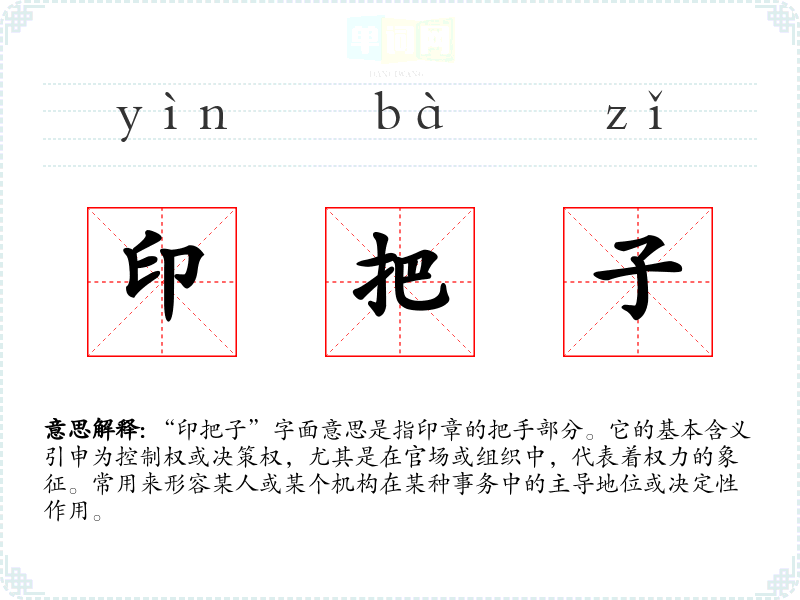 “印把子”字面意思是指印章的把手部分。它的基本含义引申为控制权或决策权,尤其是在官场或组织中,代表着权力的象征。常用来形容某人或某个机构在某种事务中的主导地位或决定性作用。