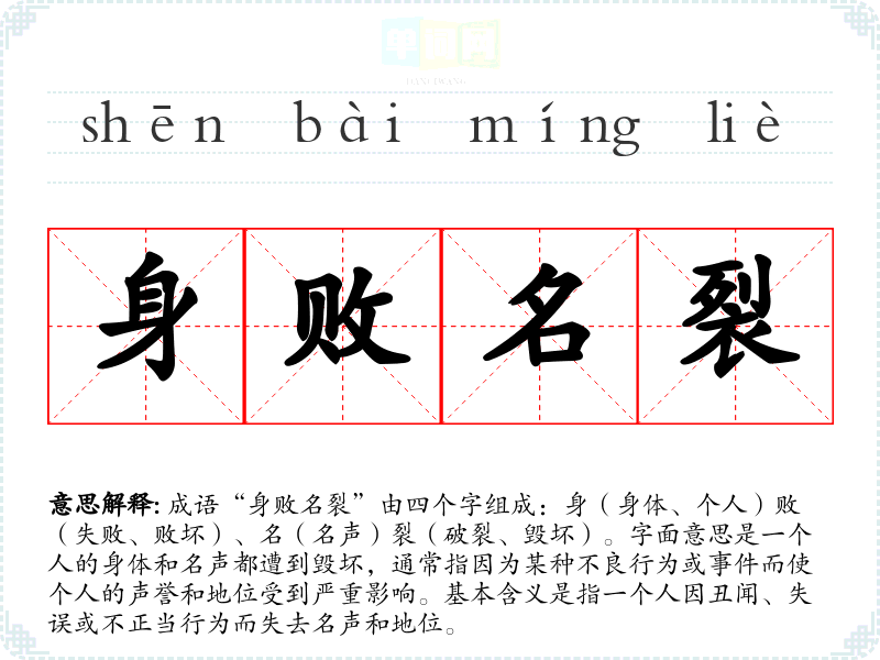 成语“身败名裂”由四个字组成:身(身体、个人)败(失败、败坏)、名(名声)裂(破裂、毁坏)。字面意思是一个人的身体和名声都遭到毁坏,通常指因为某种不良行为或**而使个人的声誉和地位受到严重影响。基本含义是指一个人因丑闻、失误或不正当行为而失去名声和地位。