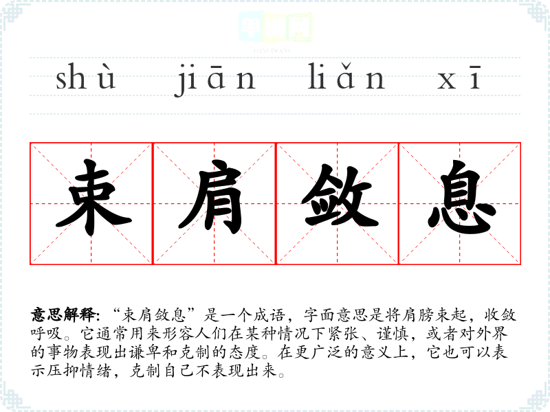 “束肩敛息”是一个成语,字面意思是将肩膀束起,收敛呼吸。它通常用来形容人们在某种情况下紧张、谨慎,或者对外界的事物表现出谦卑和克制的态度。在更广泛的意义上,它也可以表示压抑情绪,克制自己不表现出来。