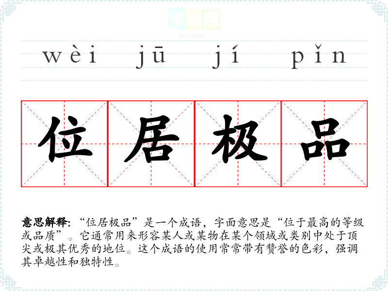 在**文化中,追求卓越和独特性是一个普遍的价值观。因此,“位居极品”不仅仅是对事物品质的赞美,也反映了社会对成功和优秀的崇尚。在现代社会,这个成语的适用性依然存在,常用于商业、艺术和社会活动中。