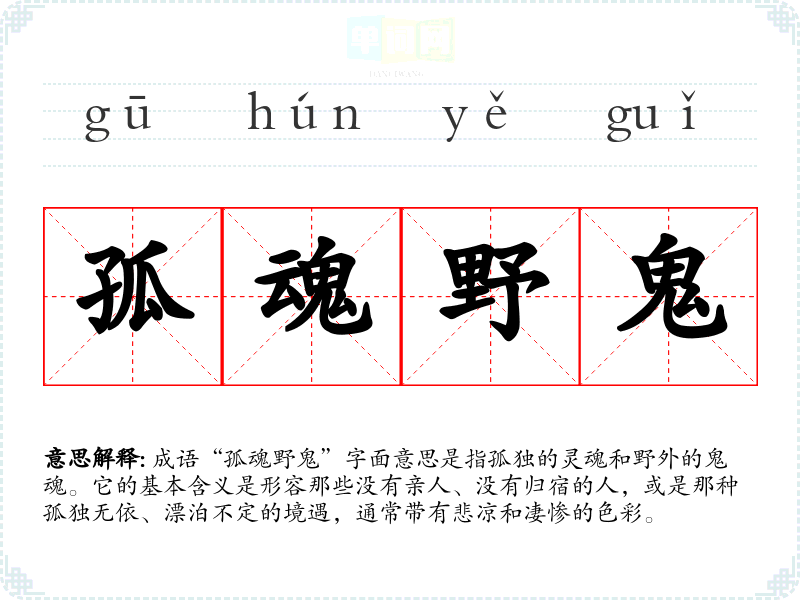成语“孤魂野鬼”字面意思是指孤独的灵魂和野外的鬼魂。它的基本含义是形容那些没有亲人、没有归宿的人,或是那种孤独无依、漂泊不定的境遇,通常带有悲凉和凄惨的色彩。