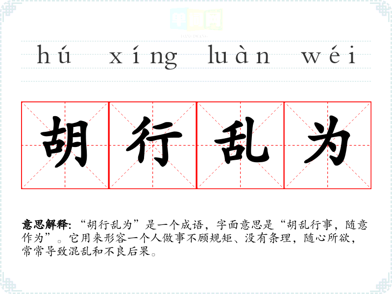 “胡行乱为”是一个成语,字面意思是“胡乱行事,随意作为”。它用来形容一个人做事不顾规矩、没有条理,随心所欲,常常导致混乱和不良后果。