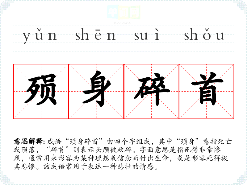 成语“殒身碎首”由四个字组成,其中“殒身”意指死亡或陨落,“碎首”则表示头颅被砍碎。字面意思是指死得非常惨烈,通常用来形容为某种理想或信念而付出生命,或是形容死得极其悲惨。该成语常用于表达一种悲壮的情感。