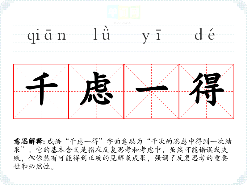 成语“千虑一得”字面意思为“千次的思虑中得到一次结果”。它的基本含义是指在反复思考和考虑中,虽然可能错误或失败,但依然有可能得到正确的见解或成果,强调了反复思考的重要性和必然性。