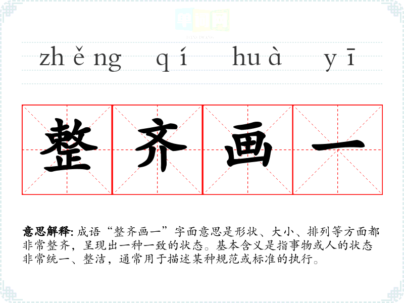 成语“整齐画一”字面意思是形状、大小、排列等方面都非常整齐,呈现出一种一致的状态。基本含义是指事物或人的状态非常统一、整洁,通常用于描述某种规范或标准的执行。