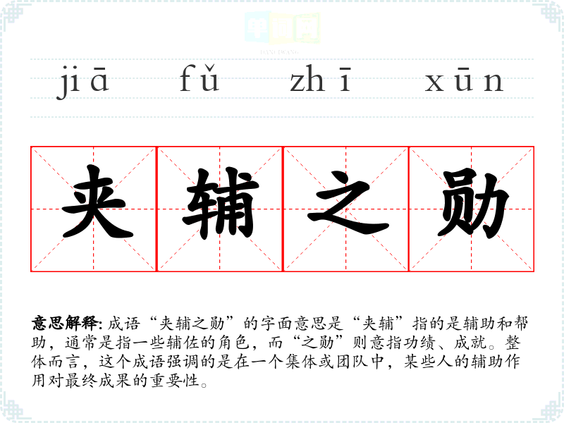 成语“夹辅之勋”的字面意思是“夹辅”指的是辅助和帮助,通常是指一些辅佐的角色,而“之勋”则意指功绩、成就。整体而言,这个成语强调的是在一个集体或团队中,某些人的辅助作用对最终成果的重要性。