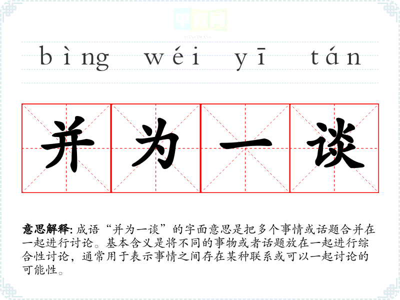 成语“并为一谈”的字面意思是把多个事情或话题合并在一起进行讨论。基本含义是将不同的事物或者话题放在一起进行综合性讨论,通常用于表示事情之间存在某种联系或可以一起讨论的可能性。