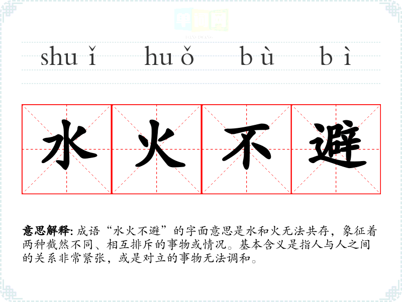 成语“水火不避”的字面意思是水和火无法共存,象征着两种截然不同、相互排斥的事物或情况。基本含义是指人与人之间的关系非常紧张,或是对立的事物无法调和。