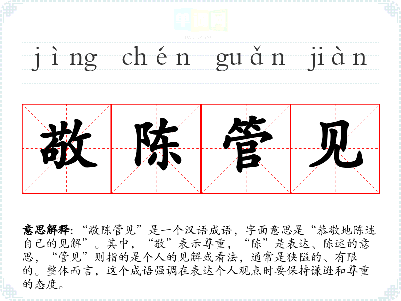 “敬陈管见”是一个汉语成语,字面意思是“恭敬地陈述自己的见解”。其中,“敬”表示尊重,“陈”是表达、陈述的意思,“管见”则指的是个人的见解或看法,通常是狭隘的、有限的。整体而言,这个成语强调在表达个人观点时要保持谦逊和尊重的态度。