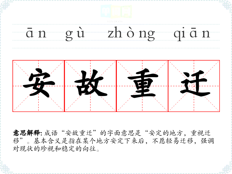成语“安故重迁”的字面意思是“安定的地方,重视迁移”。基本含义是指在某个地方安定下来后,不愿轻易迁移,强调对现状的珍视和稳定的向往。