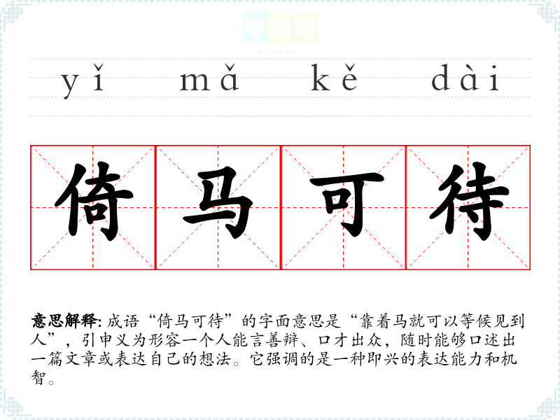 成语“倚马可待”的字面意思是“靠着马就可以等候见到人”,引申义为形容一个人能言善辩、口才出众,随时能够口述出一篇文章或表达自己的想法。它强调的是一种即兴的表达能力和机智。