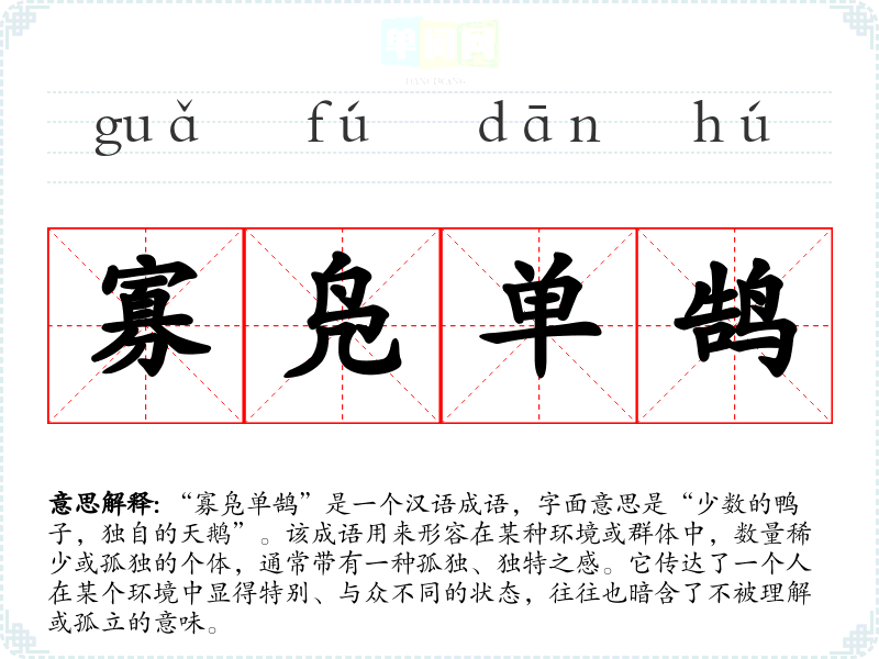 在传统**文化中,天鹅常被视为高贵的象征,而鸭子则是平常的家禽。因此,“寡凫单鹄”反映了社会中个体与群体的差异性,具有较强的文化内涵。在现代社会中,随着个体主义的兴起,这个成语可以用于描述那些追求自我价值、独立思考的人,强调他们在社会中的独特性。