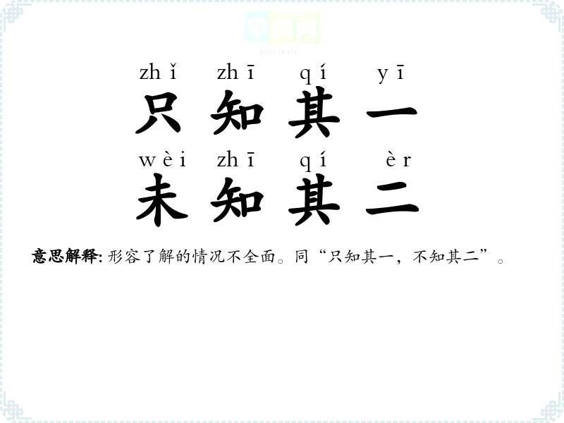 | 一知半解 | 知道得不全面,理解得也不透彻。 |