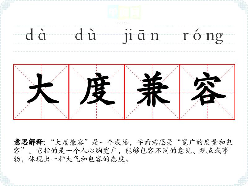 “大度兼容”是一个成语,字面意思是“宽广的度量和包容”。它指的是一个人心胸宽广,能够包容不同的意见、观点或事物,体现出一种大气和包容的态度。