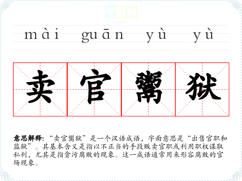 卖狱鬻官 狱:讼事;鬻:卖。收受贿赂,出卖官职爵位,徇私枉法。