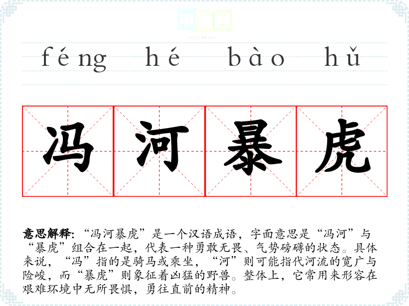 “冯河暴虎”是一个汉语成语,字面意思是“冯河”与“暴虎”组合在一起,代表一种勇敢无畏、气势磅礴的状态。具体来说,“冯”指的是骑马或乘坐,“河”则可能指代河流的宽广与险峻,而“暴虎”则象征着凶猛的野兽。整体上,它常用来形容在艰难环境中无所畏惧,勇往直前的精神。