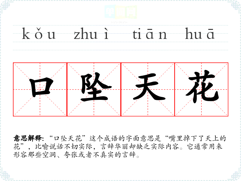 “口坠天花”这个成语的字面意思是“嘴里掉下了天上的花”,比喻说话不切实际,言辞华丽却缺乏实际内容。它通常用来形容那些空洞、夸张或者不真实的言辞。