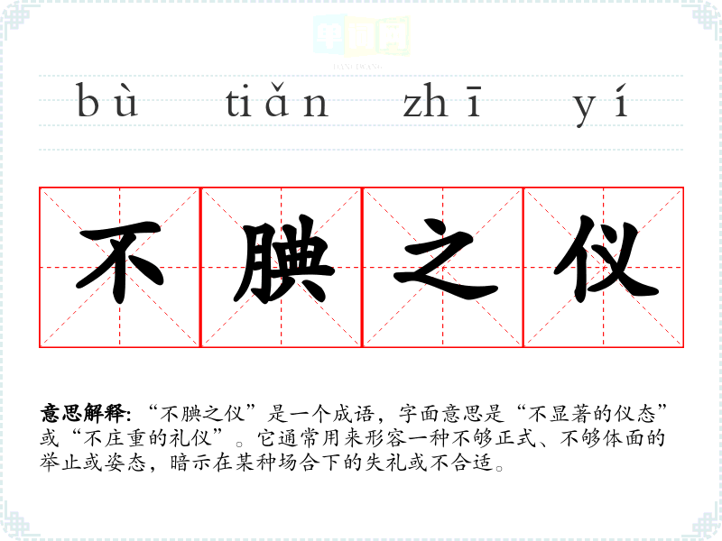 成语“不腆之仪”并没有明确的历史典故或文学出处,但可以推测其形成与古代的礼仪文化有关。在古代**,礼仪和仪态被视为个人修养的重要体现,因此“不腆之仪”可理解为对不符合礼仪要求的行为的批评。